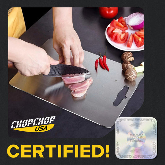 Limited-Time Offer â Get Free GiftsThe ChopChop USA Double-Sided Stainless Steel Cutting Board features two versatile surfaces: a rice husk fiber side that protects knives and a stainless steel side with antibacterial properties. Itâs the perfect solution for prepping both meats and vegetables.