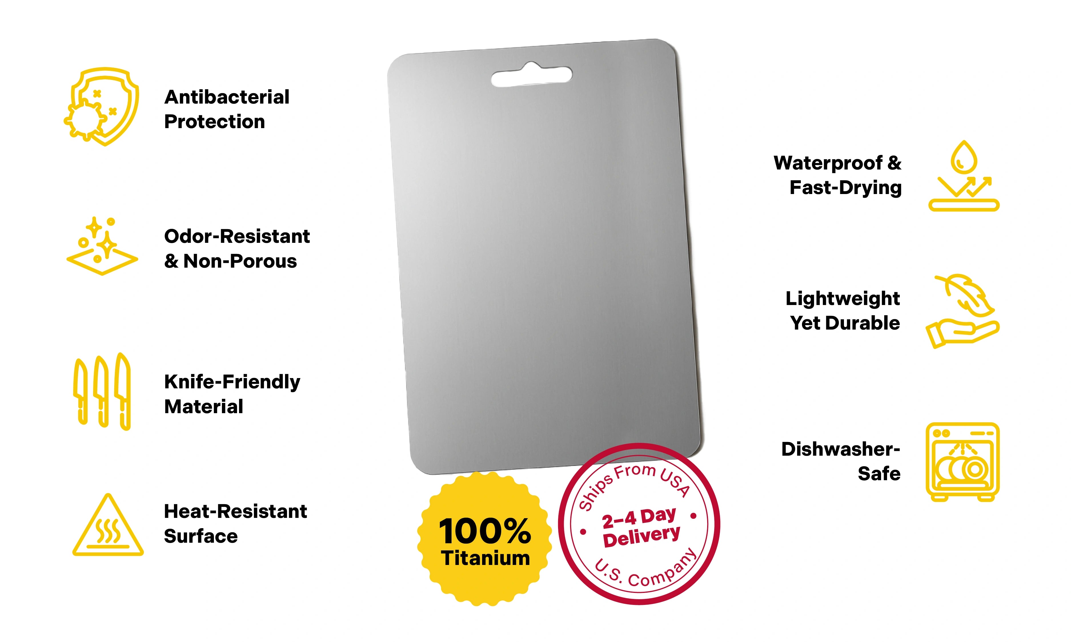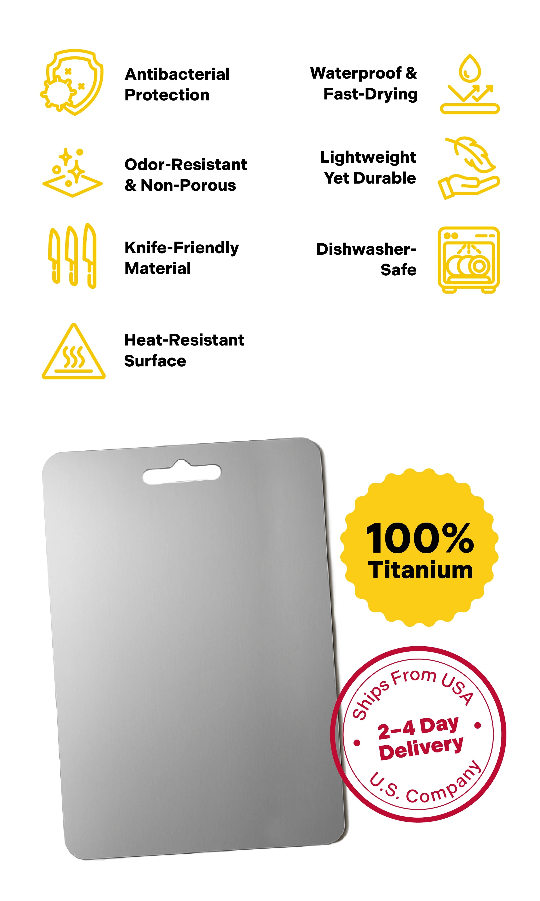 Yes, the ChopChop™ USA 100% Purre Titanium Cutting Board is completely dishwasher safe. Its non-porous titanium surface won’t warp, crack, or absorb water, making it easy to clean in the dishwasher.