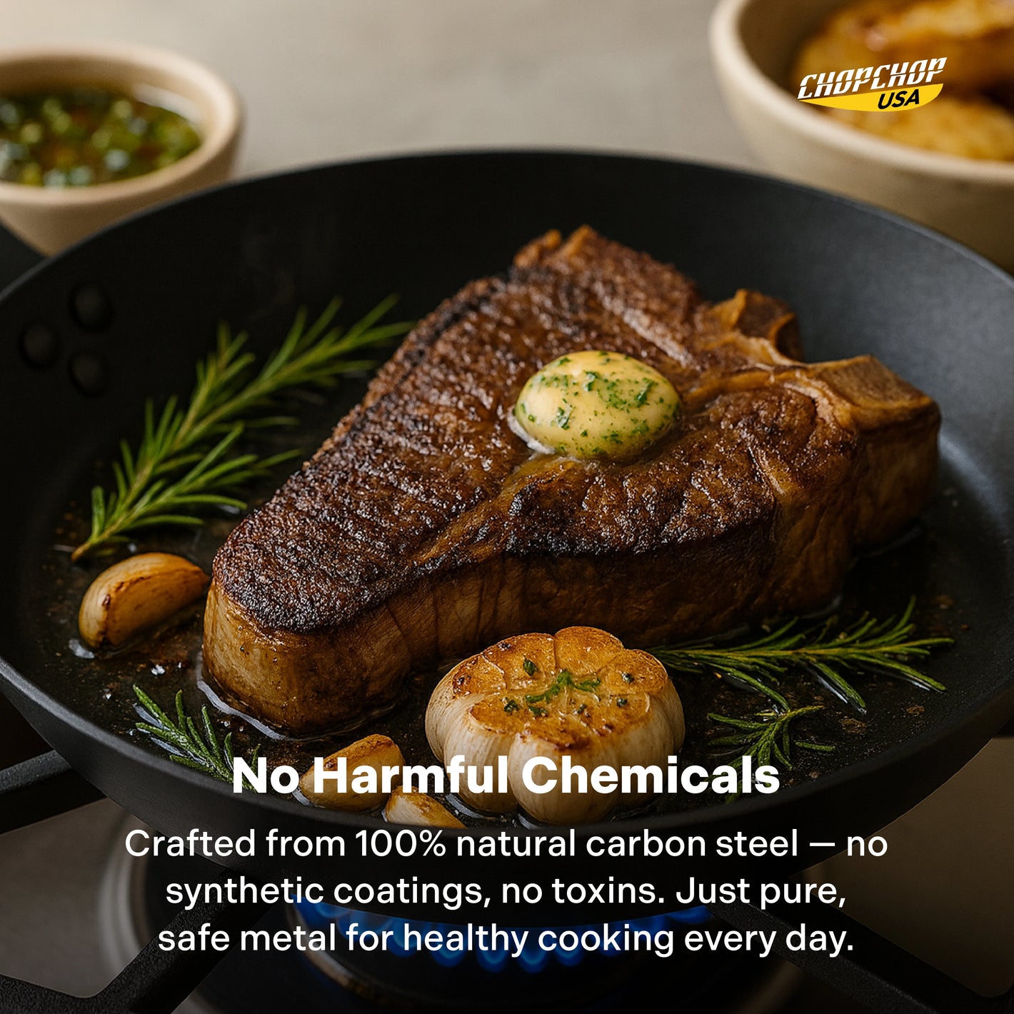 The ChopChop USA Carbon Steel Pan is built to be different. Crafted from 100% pure carbon steel, it’s completely free from coatings and toxins. Its superior heat conductivity ensures fast, even cooking, while a natural nonstick patina forms with each use—improving performance instead of degrading over time.