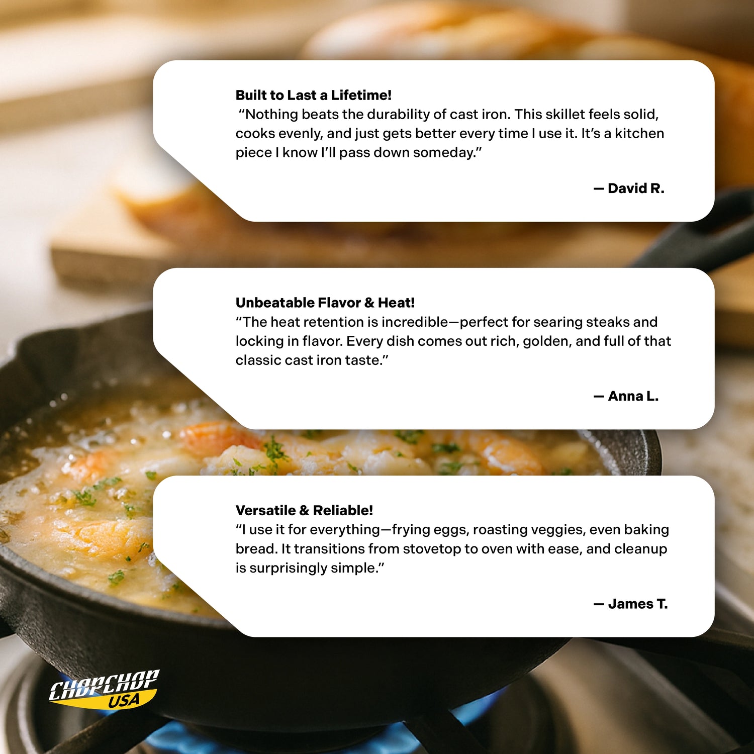Every ChopChop USA Cast Iron Skillet is pre-seasoned and built to last for generations—offering natural nonstick performance, even heating, and authentic flavor that only improves with time.