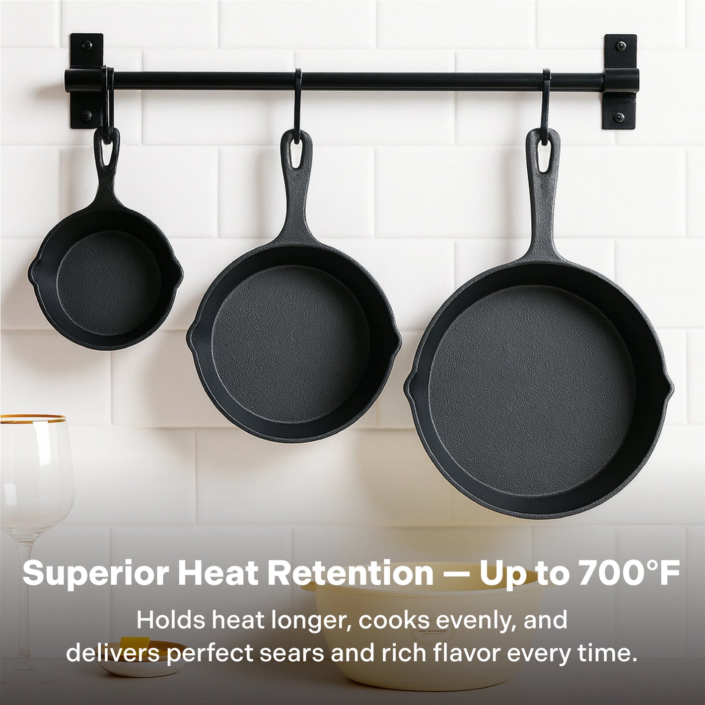 Every skillet is forged from premium-grade cast iron, pre-seasoned for immediate use, and designed to deliver exceptional heat retention, even cooking, and rich, authentic flavor.