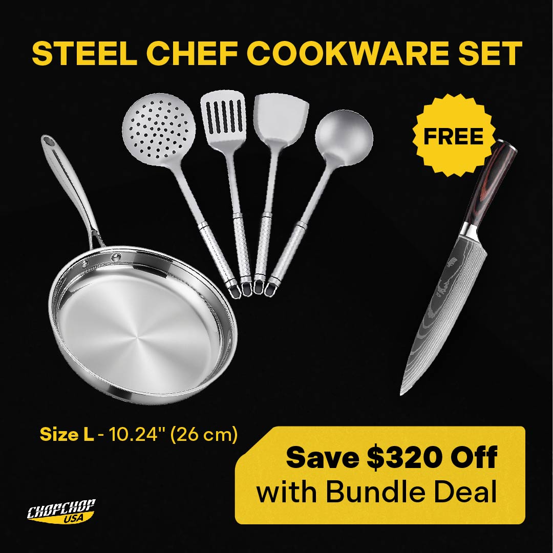 This bundle brings together two of ChopChop USA’s most trusted tools: a professional stainless steel pan and 100% pure titanium utensils. Instead of juggling flimsy pans and plastic tools, you get a setup designed for years of daily cooking.