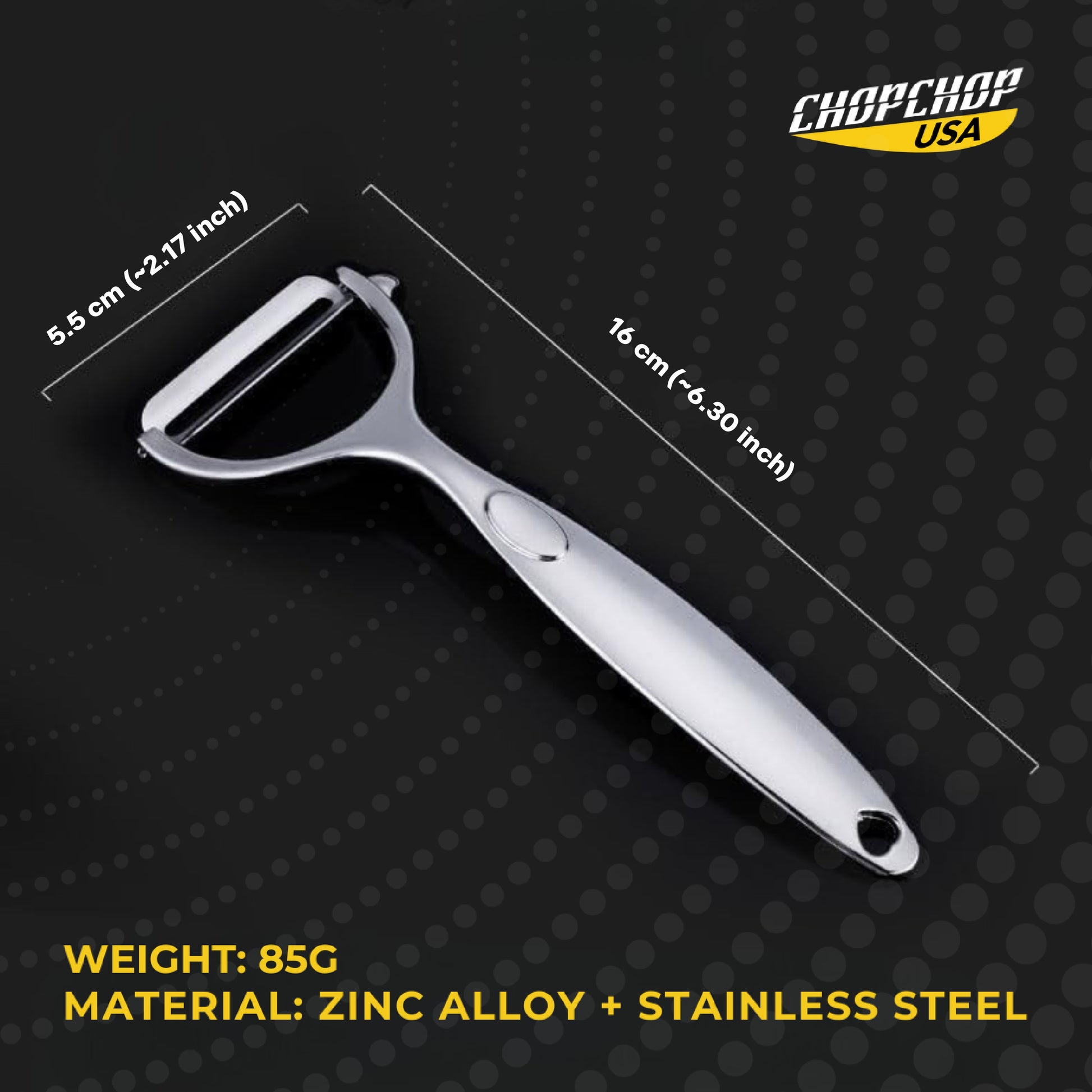 The ChopChop USA Stainless Steel Peeler features a razor-sharp, double-edged blade that effortlessly glides over fruits and vegetables for uniform, streak-free peeling.
