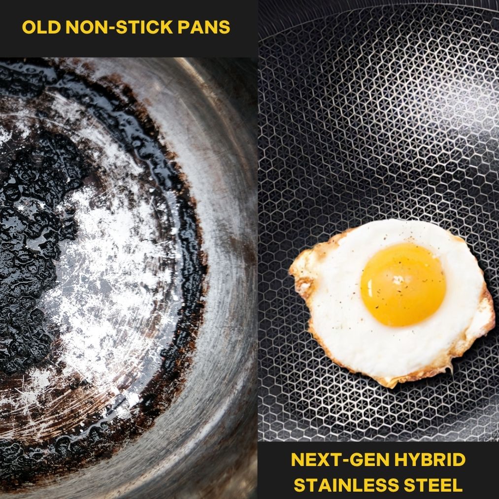Unlike traditional nonstick pans that scratch, peel, or lose performance over time, our hybrid design is built for lasting durability and consistent results. The stainless steel structure protects the nonstick surface, allowing for high-heat cooking, perfect sears, and the use of a wider variety of utensils with confidence. Its triple-layer base ensures fast, even heat distribution—no hot spots, no uneven cooking—while the oven-safe and induction-ready build makes it as versatile as your culinary ambitions.