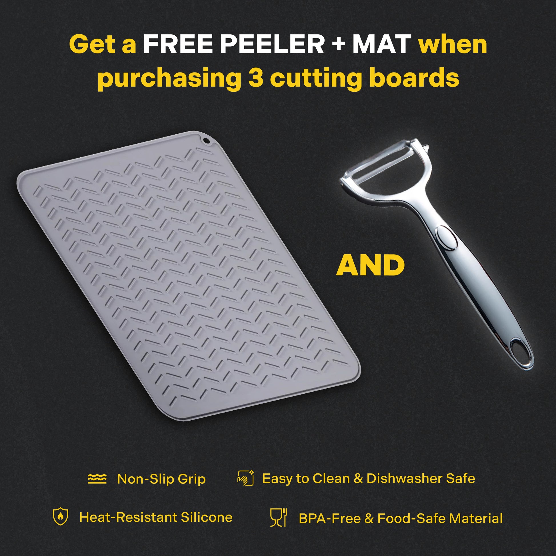 Medium (M) - 14.17" x 9.84": The ultimate all-rounder, this board fits comfortably into any kitchen setup. Great for slicing meats, dicing vegetables, or general meal prep without taking up too much counter space. It strikes the perfect balance between functionality and convenience.