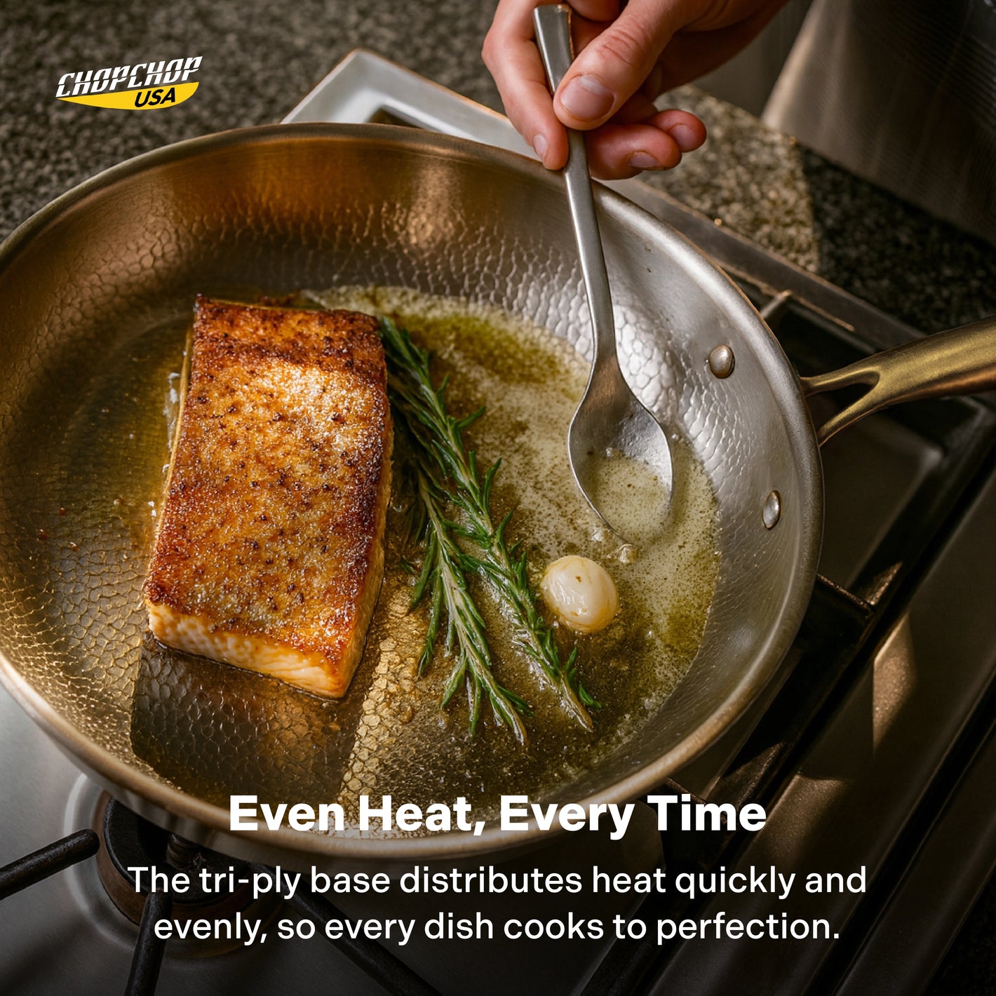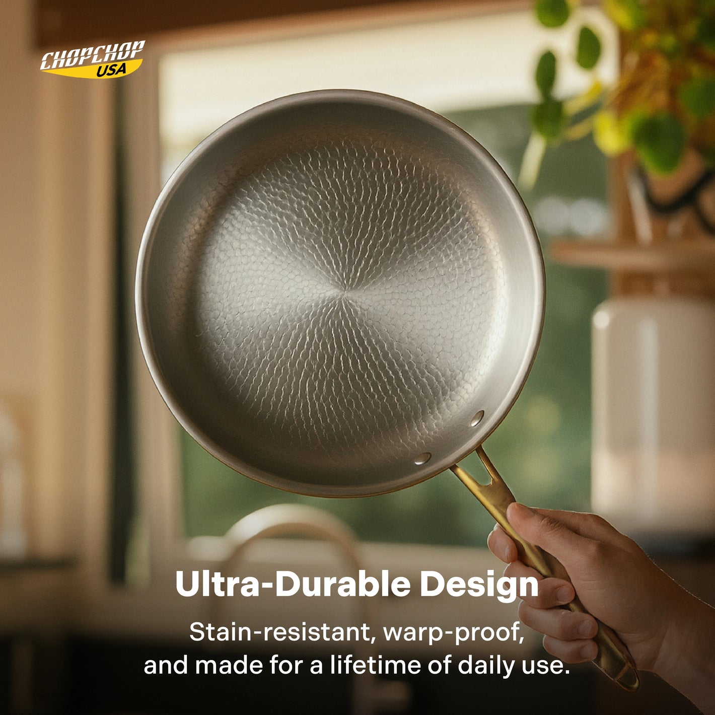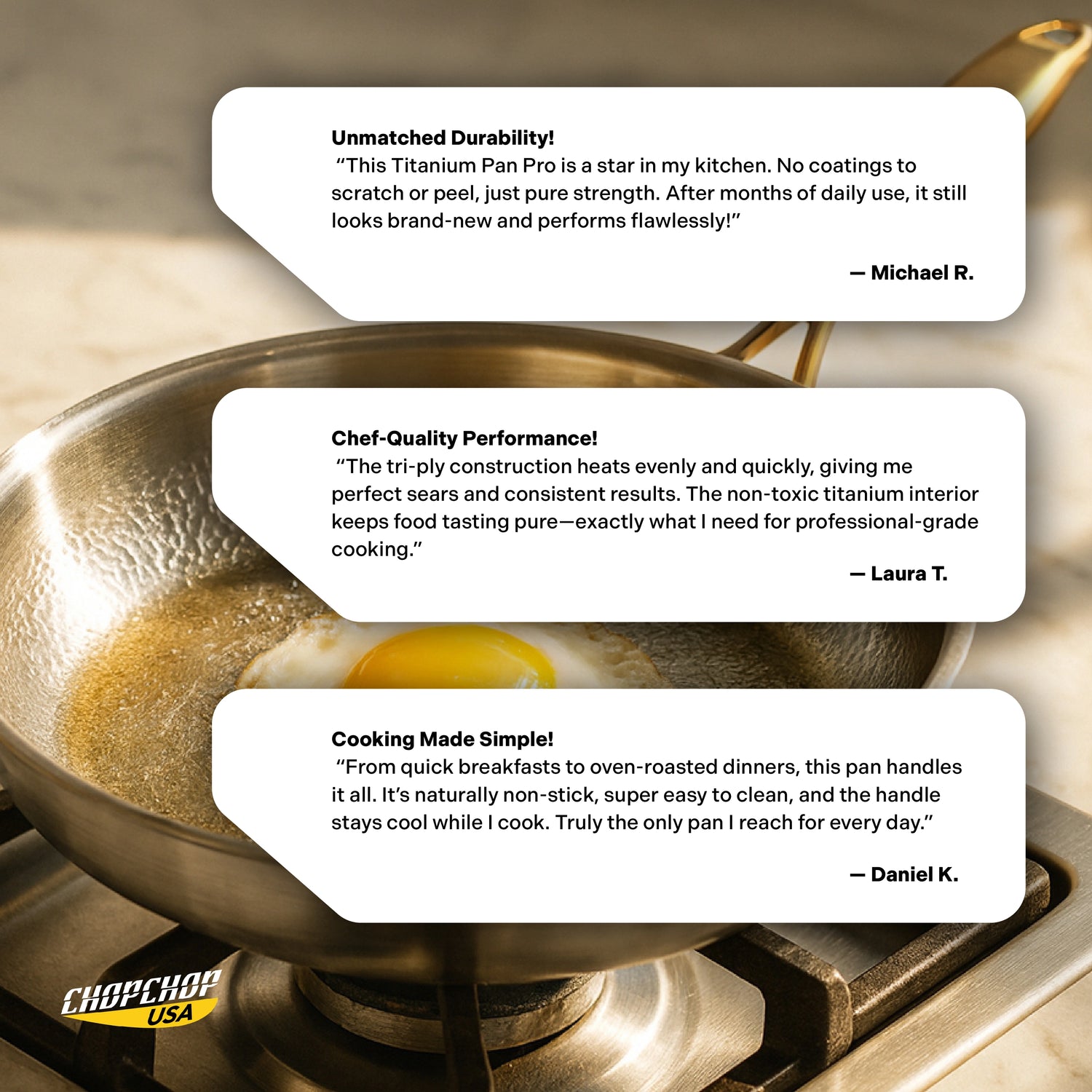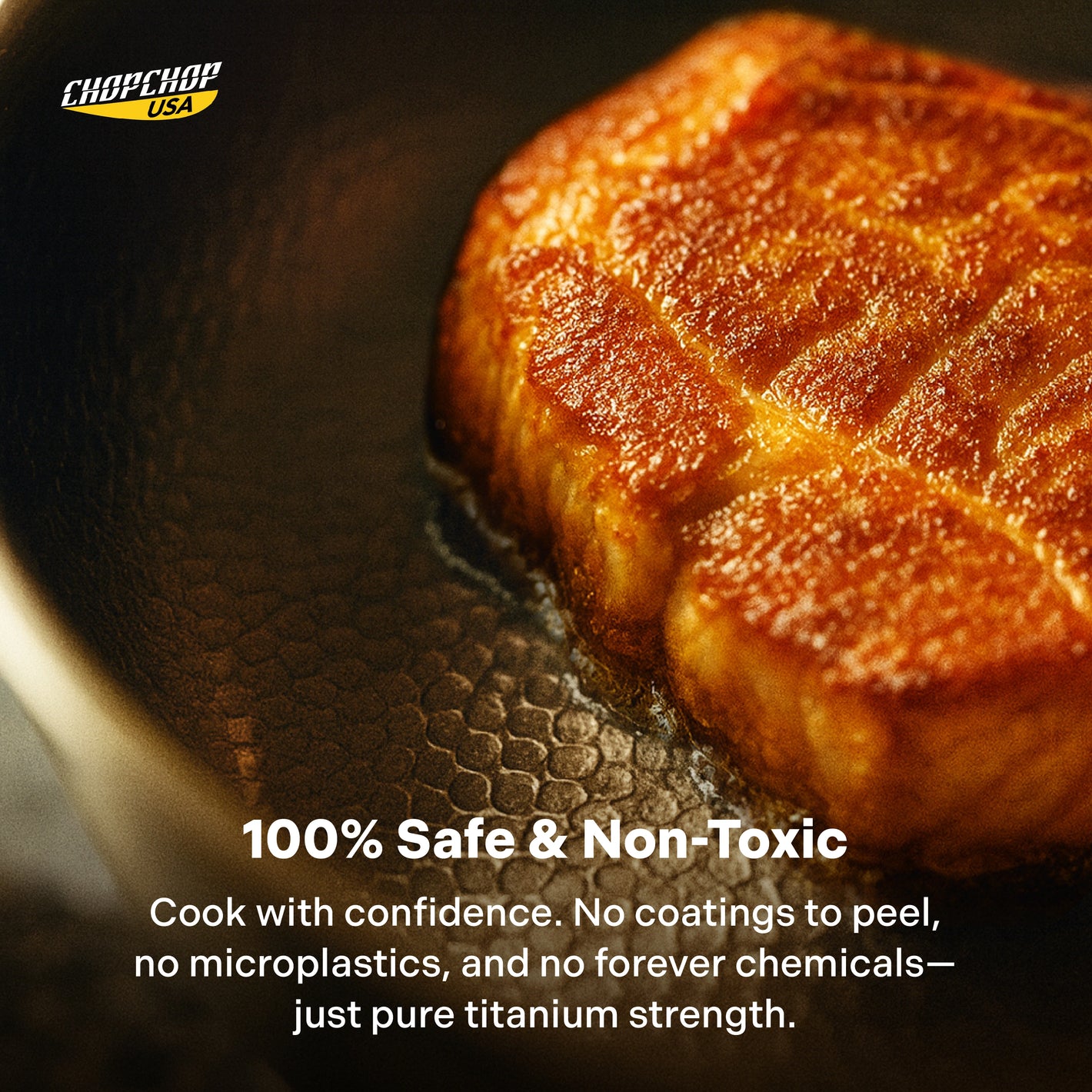 The ChopChop USA Titanium Pan Pro features a tri-ply design with a pure titanium interior, aluminum core, and stainless steel exterior—offering natural safety, exceptional durability, and fast, even heating without toxic coatings.