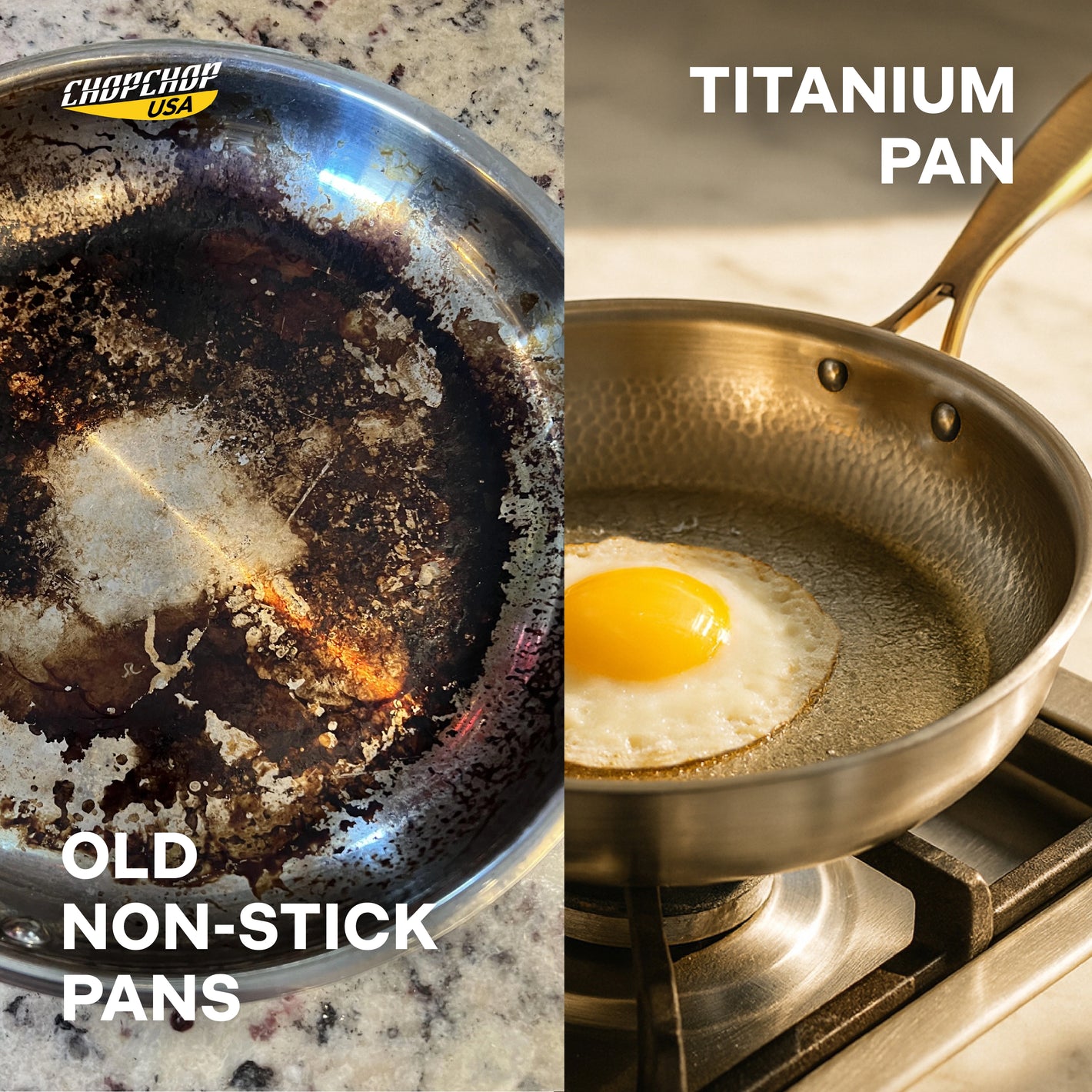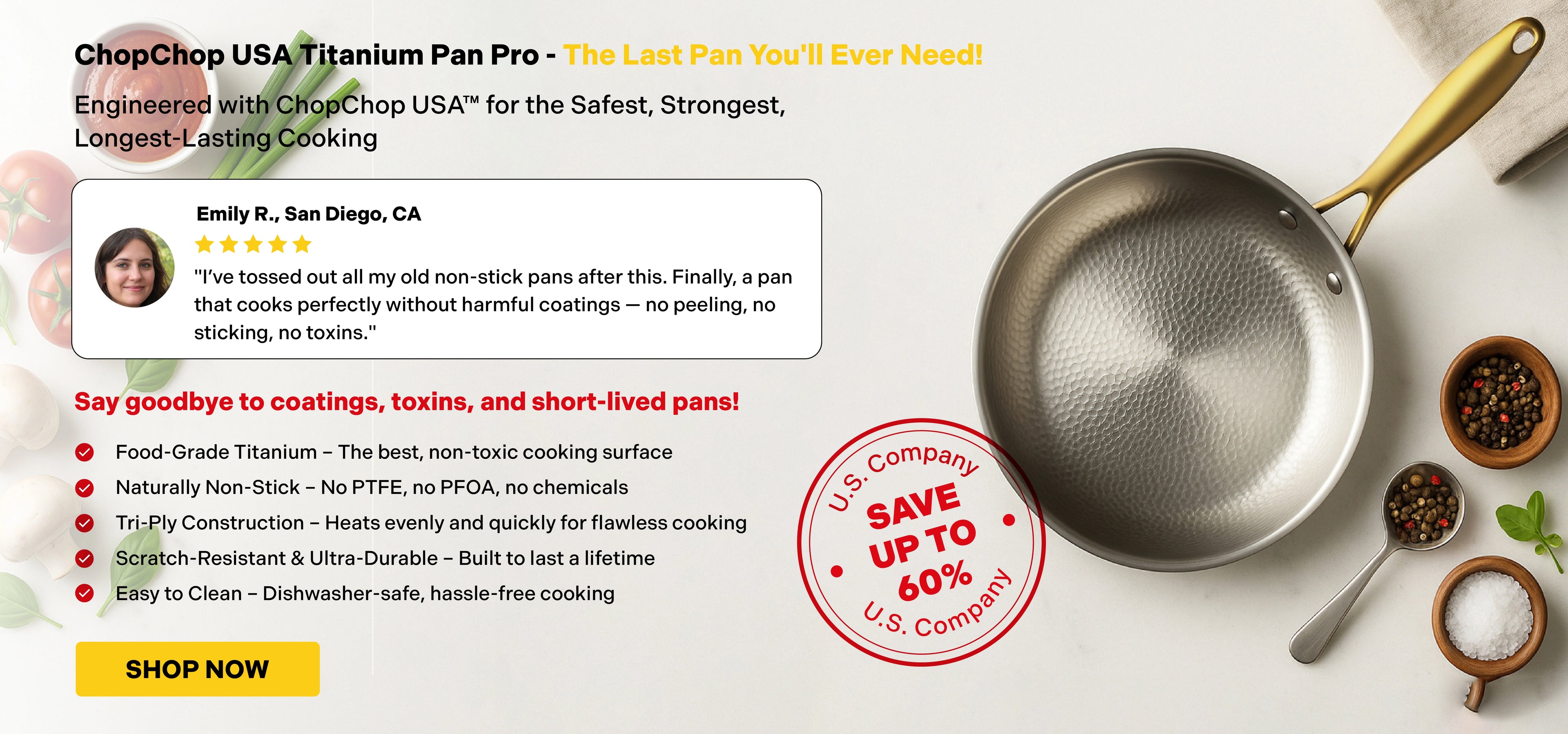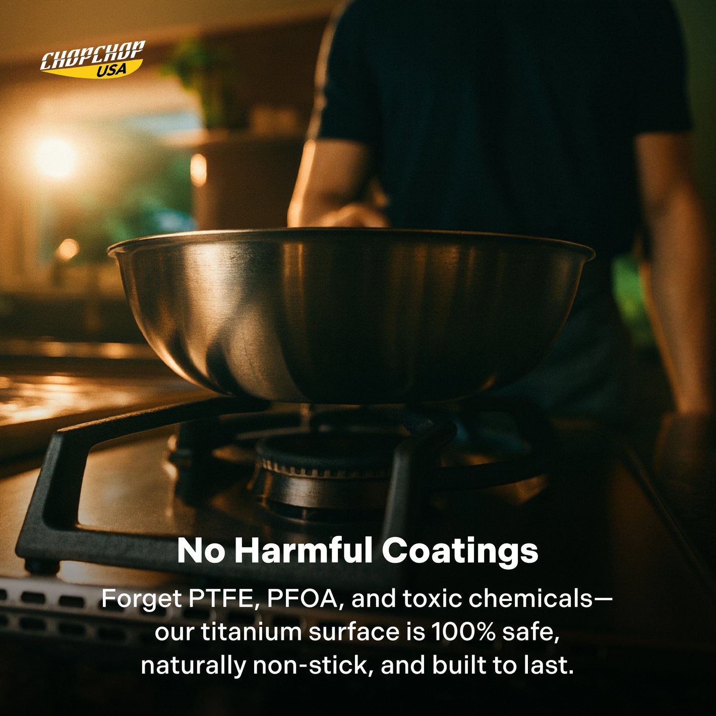 The ChopChop USA Titanium Pan Pro offers a safer solution. Its tri-ply design—featuring a pure titanium interior, aluminum core, and stainless steel exterior—delivers natural safety, lasting durability, and even heat distribution without harmful coatings. Built for everyday cooking, it keeps your meals safe, consistent, and worry-free.